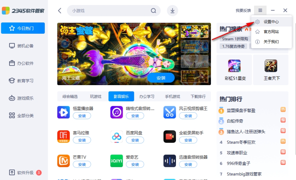 1、在2345软件管家的主界面中,找到并点击左上角的“三条杠”图标,在弹出的下拉列表中,选择“设置中心”选项。