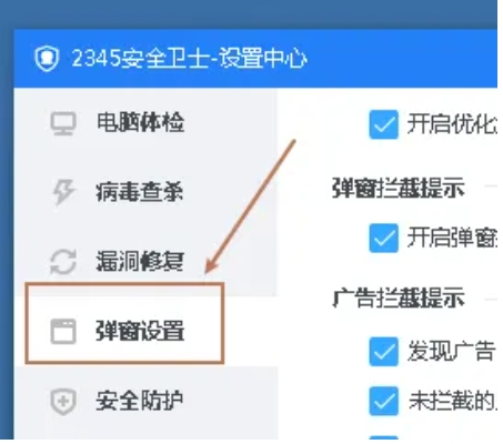 2、在设置中心页面,找到并点击左侧的“弹窗设置”选项卡。