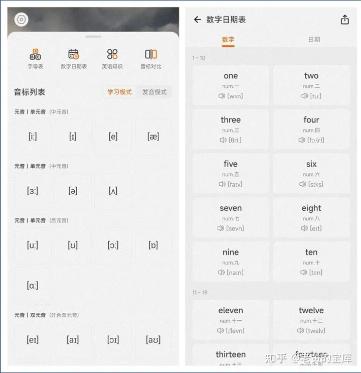 软件功能全面且实用,涵盖字母表、数字日期表、英语知识、音标学习及音标对比等多个版块。在字母表版块中,用户可清晰查看英语26个字母的大小写形式及标准发音;数字日期表版块则提供了数字、日期(包括星期、月份等)的英文书写规范与发音示例,有助于用户全面掌握英语基础知识。
