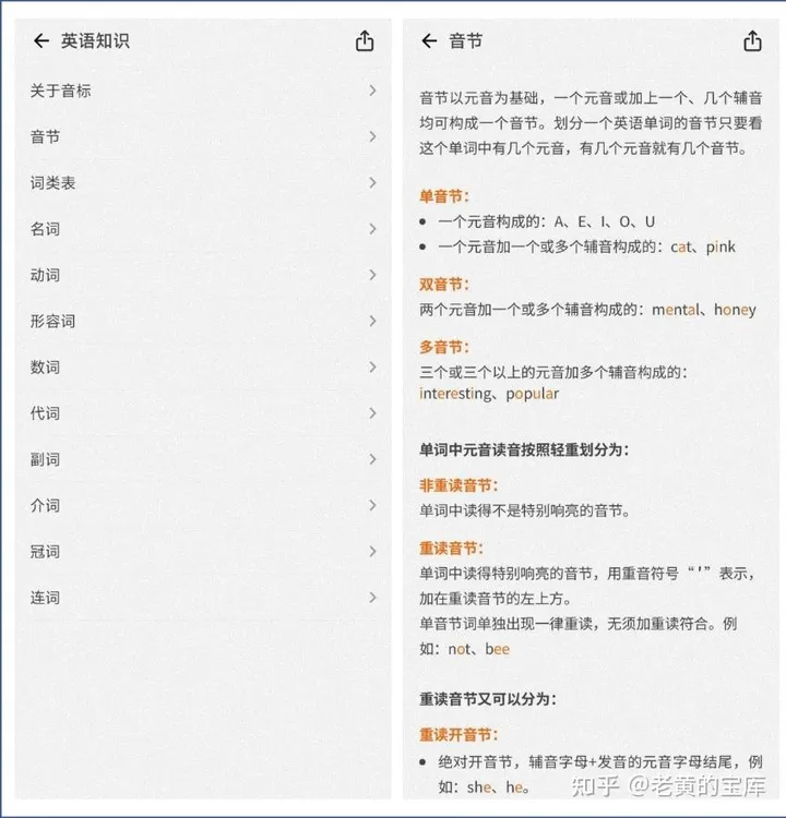 英语知识学习模块涵盖:音标、音节、词类表、名词、动词、形容词、数词、代词、副词、介词、冠词、连词等多个方面。每个知识点均以详尽的文字形式展现,例如,在名词的学习部分,内容覆盖了专有名词、普通名词、可数名词复数形式的构成规则、不可数名词以及名词所有格等;而在代词的学习部分,则涉及了人称代词、不定代词、疑问代词、指示代词等详细分类。