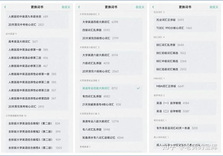 在词书方面,简背单词涵盖了丰富的英语词汇资源,分类广泛,包括但不限于考研、小学至高中、大学英语、四六级、专四专八、考博、雅思、托福、GRE、SAT、BEC、MBA、GMAT、ACT、自学考试及专升本等,每个分类下均包含多个具体词书供用户选择。