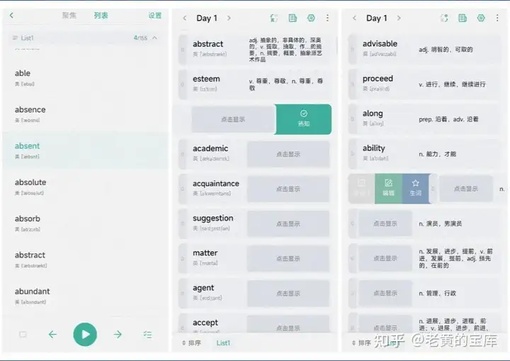 此外,用户还可通过左滑单词表示熟知,右滑单词进行标记、编辑或加入生词本,长按单词则可直接进入字典查询界面,极大提升了学习效率和便捷性。