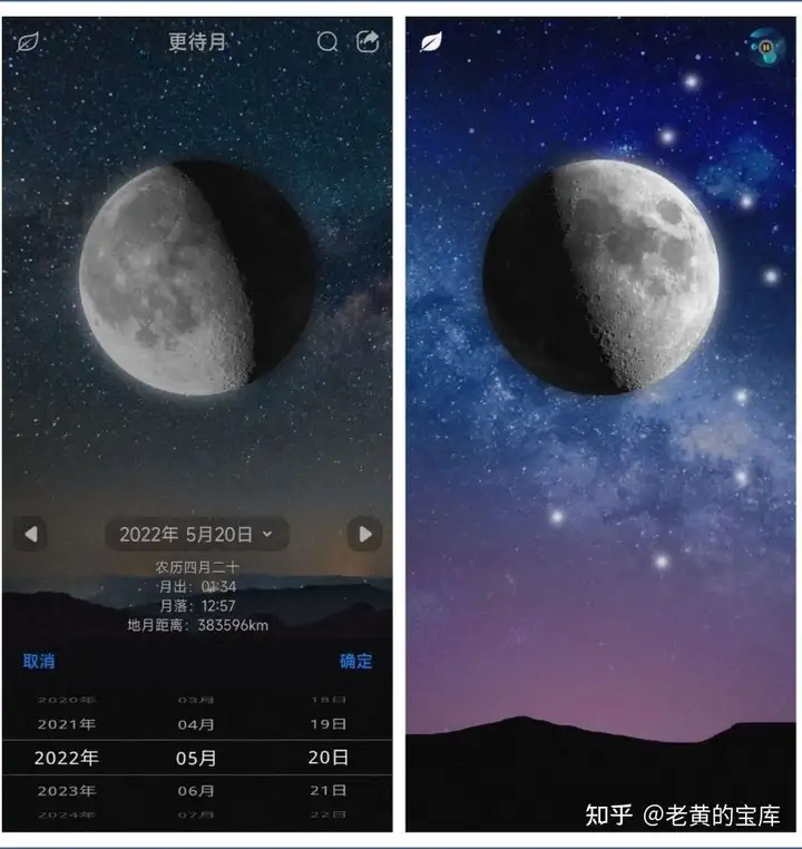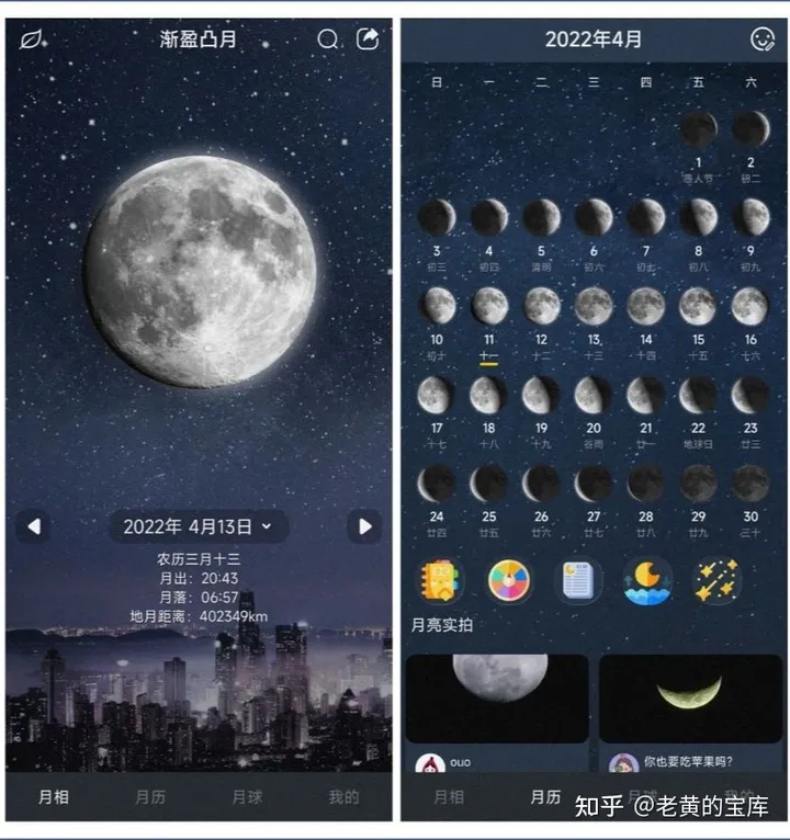在月相盈亏功能方面,该软件能够清晰展示不同日期月亮的形态,帮助用户理解月亮的阴晴圆缺变化规律。用户可自由选择任意一天进行查看,系统将提供包括月相名称、月出时间、月落时间以及地月距离在内的详细信息。