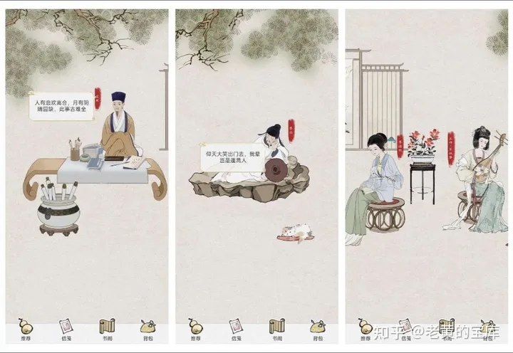 该应用完全免费,其界面设计令人耳目一新,整体氛围弥漫着浓厚的古风韵味,视觉效果唯美而雅致,布局极简而不失精致,展现出极高的审美水准。在主界面上,苏轼、辛弃疾、李清照、李白等古代文学巨匠的动态形象栩栩如生,他们或静谧沉睡,或抚琴自赏,或沉浸书海,与悠扬的背景音乐及轻轻摇曳的树枝相映成趣,营造出一种穿越时空的错觉,引领用户步入千年前的文化殿堂。