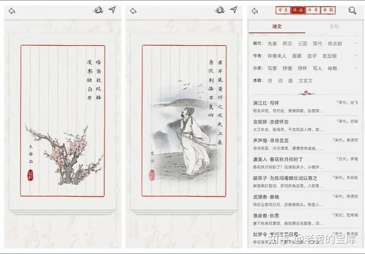 在书阁版块中,该应用展现了其强大而全面的诗词资源库。书阁细分为分类、作品、作者和古籍四大板块,其中分类板块依据诗词的主题、选集、写景、节日等多个维度进行细致划分,每个分类下又涵盖众多具体选项,如词牌选项便囊括了如梦令、醉花阴、定风波等经典词牌。作品版块则汇集了诗文与名句精华,同样按照朝代、作者、主题等标准进行分类整理。作者版块则按时间顺序展示了各时期著名诗人及其作品数量,同时兼顾近现代诗词作者的贡献。古籍版块更是涵盖了经、史、子、集四大部类,为学术研究者提供了宝贵的资料来源。