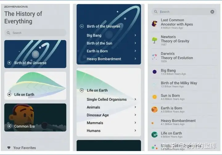 其主要特色在于采用时间线展示方式,自宇宙诞生之初至地球生命的演变,用户可通过上下滑动时间线,轻松浏览并了解各个历史时期的重要事件。此外,该应用还内置了强大的搜索功能及全面的分类体系,为用户提供便捷的历史信息查询与探索体验。