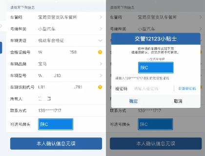 确认前,请再次核对车辆信息和号牌号码是否无误。