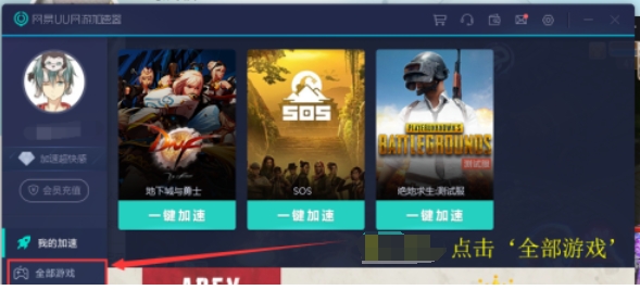 1、在UU加速器的主界面中,点击“全部游戏”。