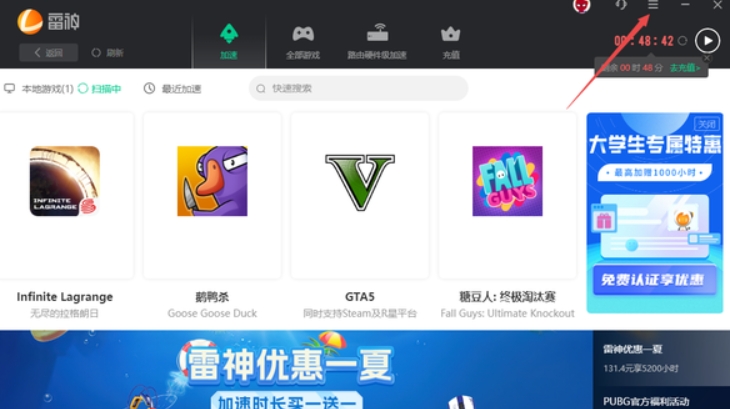 第一步,启动电脑端的雷神加速器,点击软件顶部右上角的【三】图标。