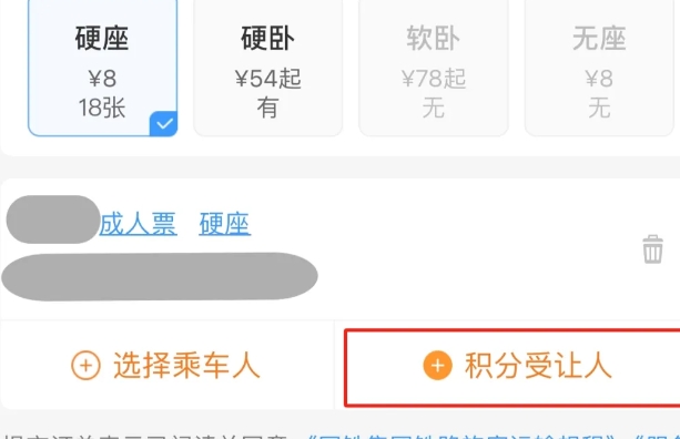 点击带有“兑”字标识的车次,进入预订页面。选择乘车人(需为已设置的积分受让人),并确认订单信息。