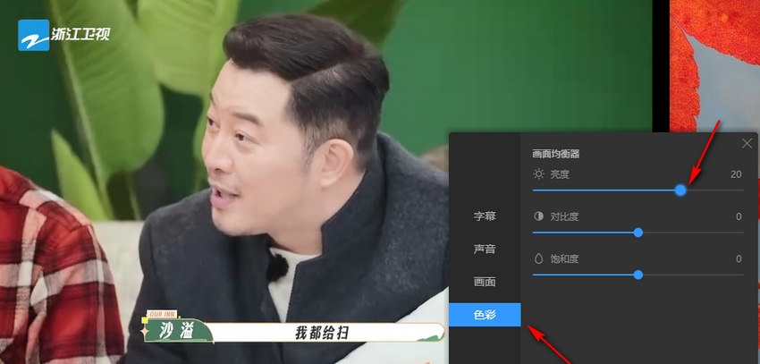 4.随后,我们在设置窗口中,将【色彩】选项点击打开,在色彩的窗口中,用鼠标左键移动【亮度】下的滑动按钮向右,即可将亮度调亮。