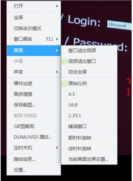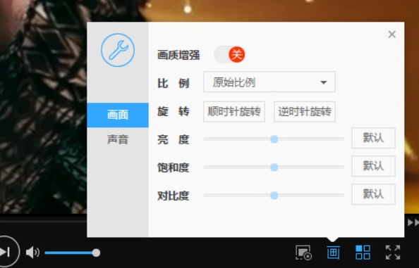 3、调节画面:点击播控条下方的播放效果设置按钮,可以调整画面的比例、亮度、对比度等