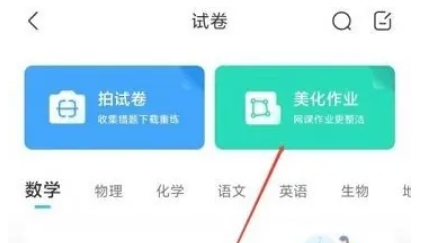 在试卷功能界面中,继续寻找并点击“美化作业”的选项。这个选项可能是直接显示在页面上,也可能需要你进一步滑动页面或点击某个子菜单才能找到。点击后,你将进入作业美化的操作界面。