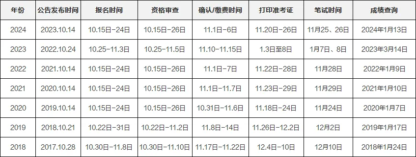 首先,让我们回顾一下过去几年国家公务员考试的公告发布和报名时间。通常情况下,公告发布与报名时间相隔一天,而与笔试时间的间隔大约为35至40天。以往,公告通常在10月发布,而笔试则安排在11月底或12月初。