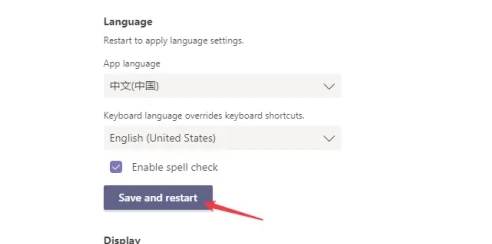 在选择完语言后,找到并点击【save and restart】(保存并重启)按钮。这将保存您的语言设置,并自动重启Teams应用程序以使更改生效。