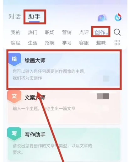 1、在讯飞星火APP页面,点击左上方的助手图标,在弹出的选项中选择“绘画大师”项目。