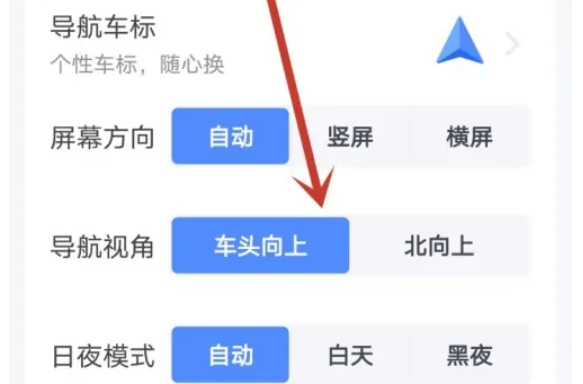 点击该选项后,可以看到有两个可选的导航视角:“车头向上”和“北向上”。根据个人的喜好和需求,选择适合的导航视角进行更改。