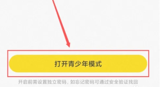 在“青少年模式”页面中,点击页面下方的“打开青少年模式”按钮。这将启动青少年模式的设置流程。
