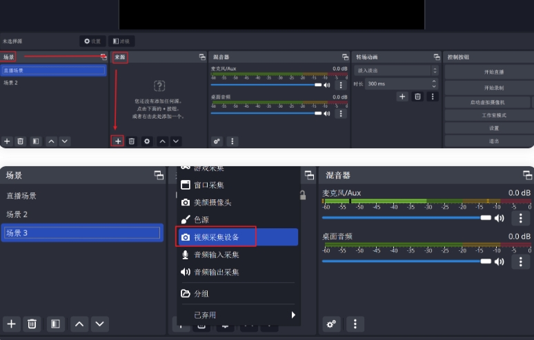 在“来源”面板中,点击左下角的“+”号按钮,选择“视频采集设备”。