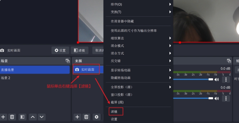 右键点击视频采集设备的实时画面,选择“滤镜”。