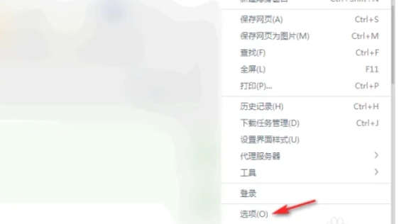 在弹出的菜单中,找到并点击“选项”或类似的字样,以进入浏览器的设置页面。