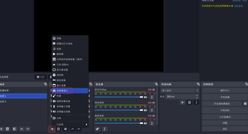 2、在OBS的主界面中,单击来源视窗底部的“+”按钮,唤出菜单,选择“视频采集设备”,然后按照提示添加一个视频采集设备。