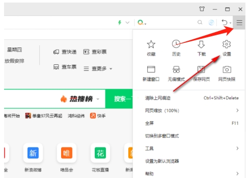 1、在浏览器右上角,找到并点击三条横杠的图标,在弹出的菜单中,选择“设置”选项。