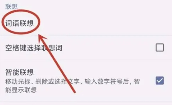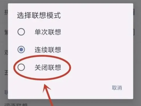 在“词语联想”设置项中,可以看到几个选项,如“单次联想”、“连续联想”和“关闭联想”。为了删除输入法的联想词,需要选择“关闭联想”选项。