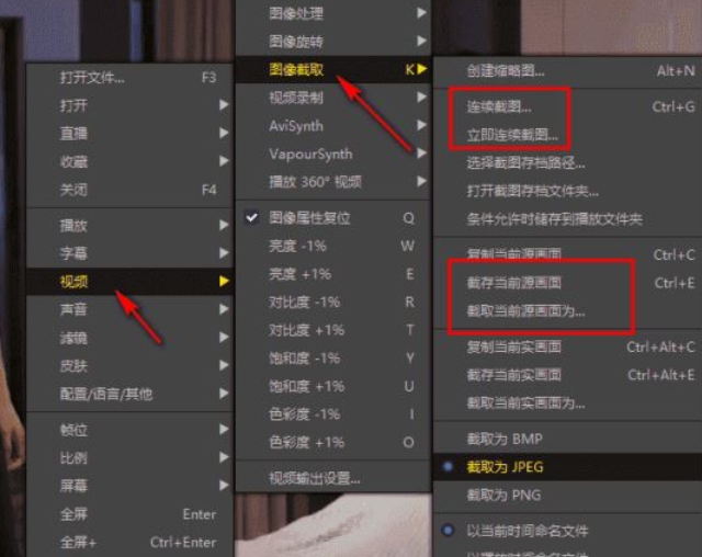 2、在视频播放界面上右键点击,弹出右键菜单,在右键菜单中选择“视频”->“图像截取”->“连续截图”即可。