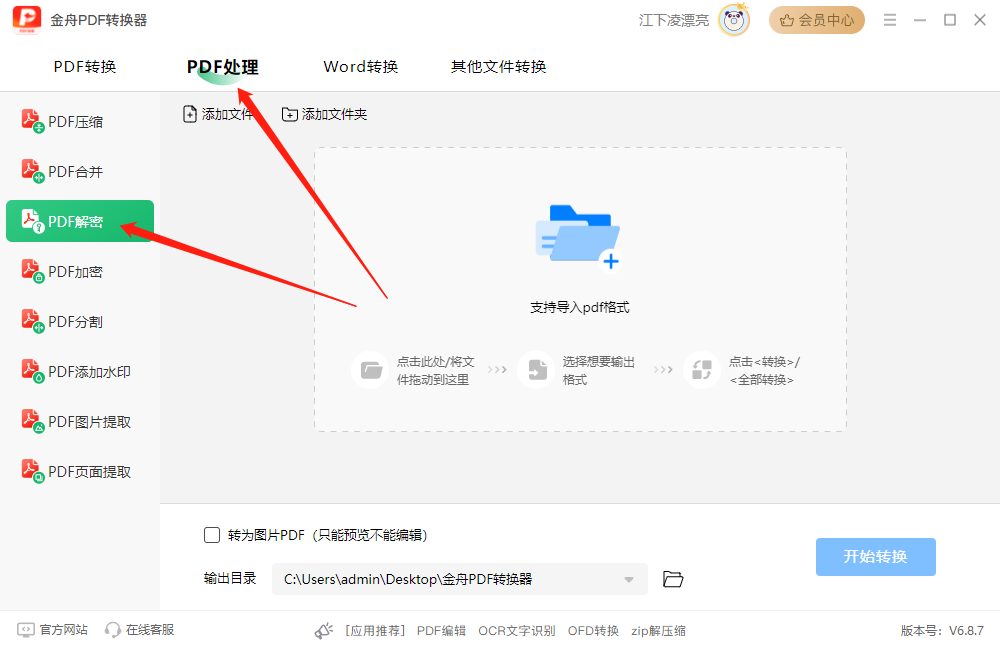 专业的pdf转换器除了提供格式转换之外,还提供了pdf一系列的处理功能,包括常用的pdf压缩、pdf合并、pdf解密、pdf加密、pdf分割、pdf添加水印等功能,功能上可以说很齐全了,使用上也是如此,pdf解除密码具体操作如下: