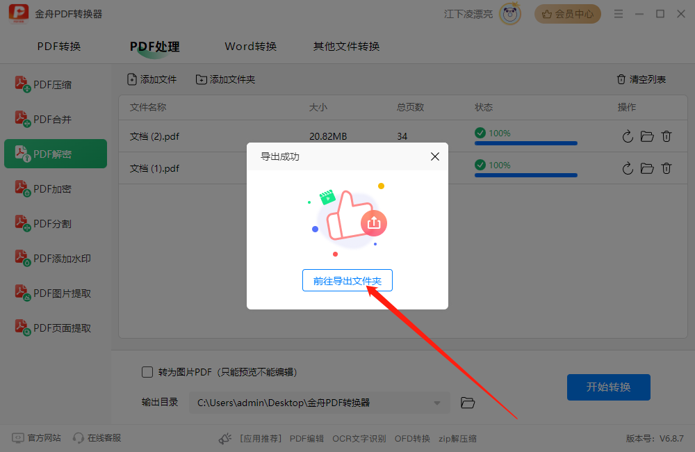 第四步、pdf解密密码后,点击前往导出文件夹查看;