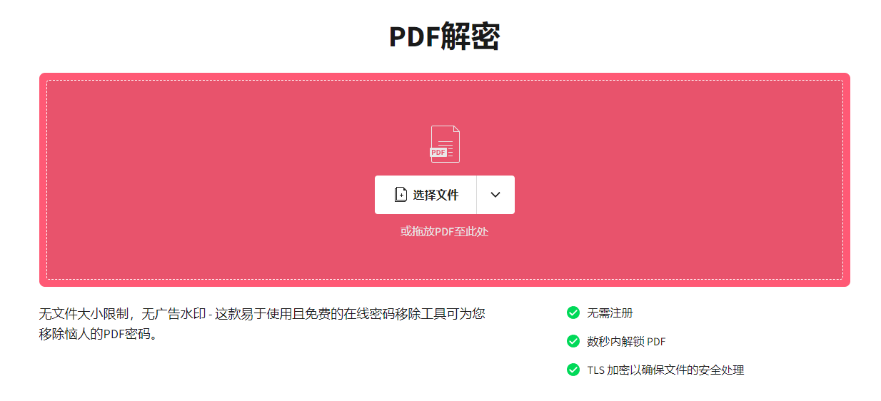 在线工具是解密pdf密码的相对简单的方法之一,不用下载密码,直接上传pdf文件就能解密,解密后的文件另外下载到电脑就可以了。唯一的不足之处就是,在线解除pdf密码只能单个处理,不能批量解除