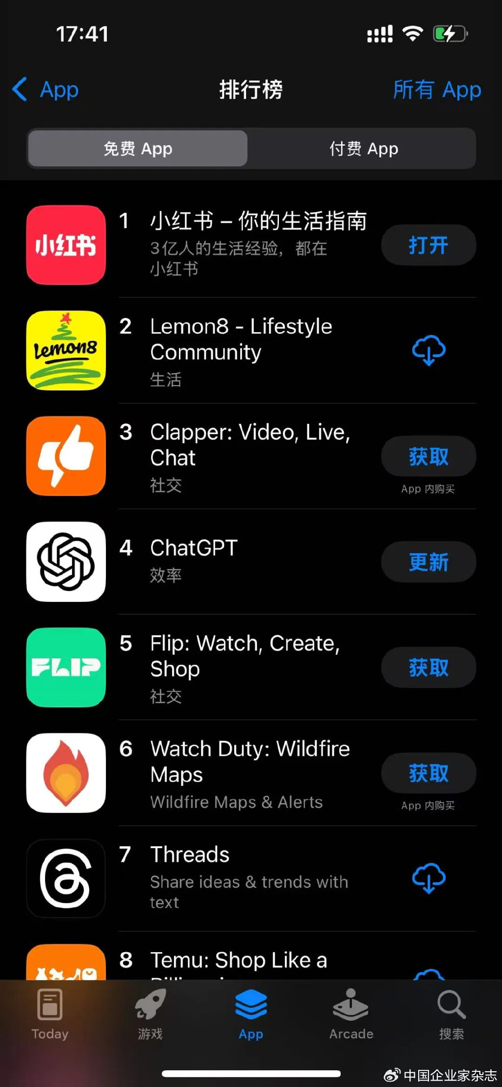 最直接的影响是,小红书这款全名由中文汉字组成的中国应用,登上了美国App Store的榜首,其热度甚至超过了字节跳动旗下TikTok重金推广的Lemon8,以及因美国加州火情而备受瞩目的Wildfire Maps。根据七麦数据,截至2025年1月14日16:29,小红书已经成为美国 AppStore 免费下载排行榜第一的应用,紧随其后的是TikTok 旗下照片共享应用 Lemon8 和 OpenAI 的ChatGPT。