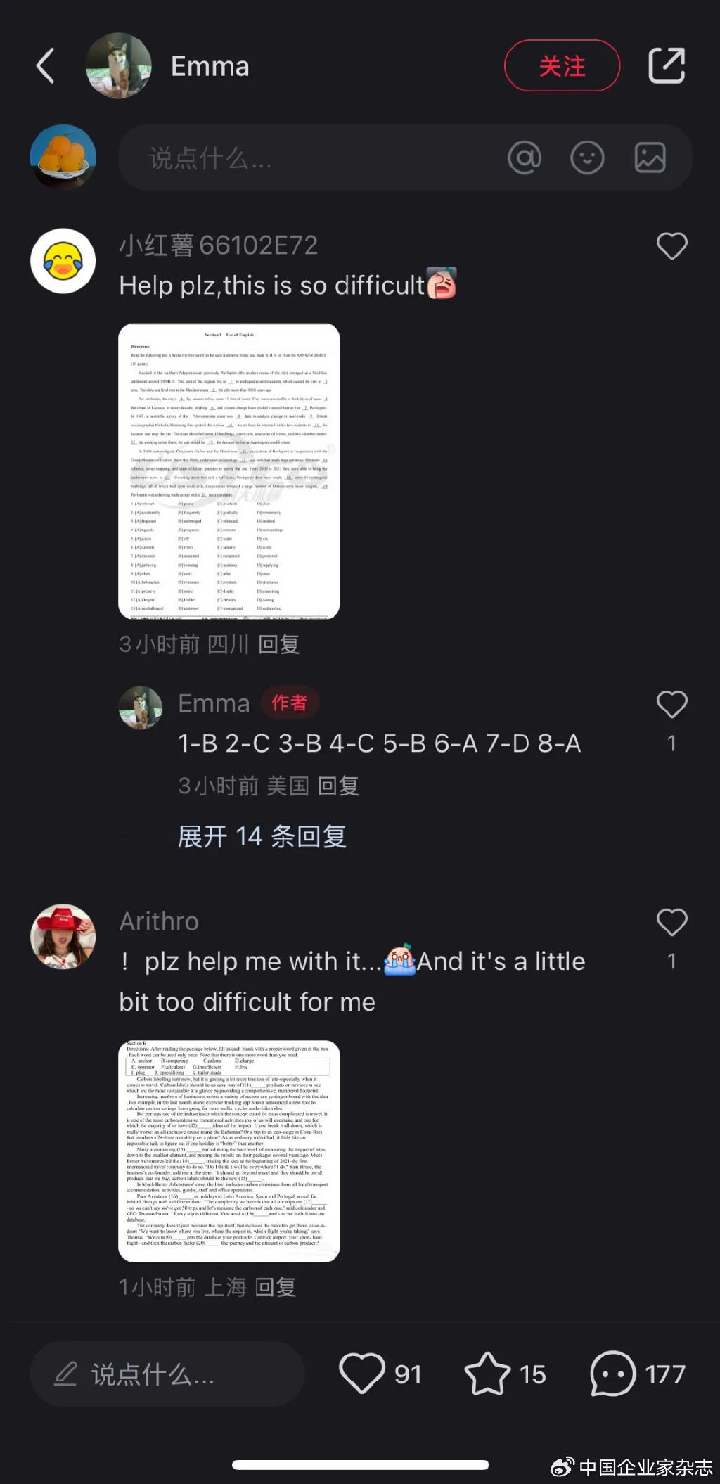 目前,小红书社区的氛围在中文互联网社交平台中是独一无二的:用户们在评论区互相分享猫狗宠物的照片,通过中英文翻译交流彼此对对方国家的记忆和印象,甚至有用户上传了一张英文试卷,急切地寻求美国用户的帮助以解答。
