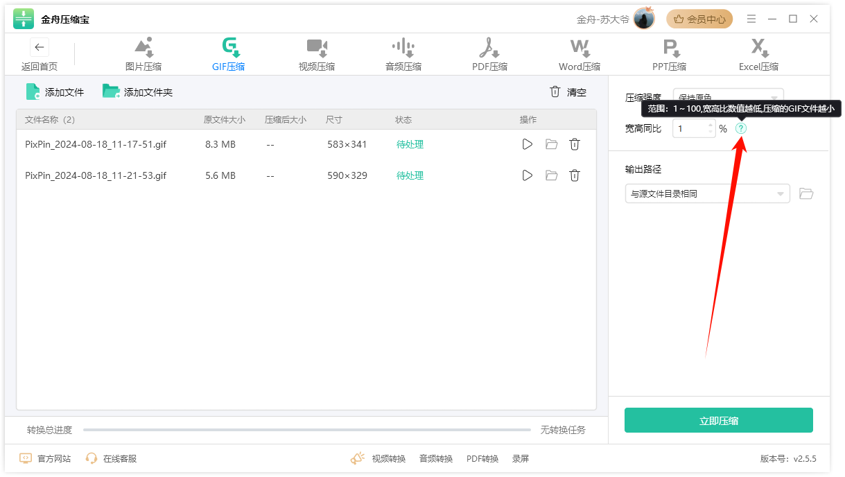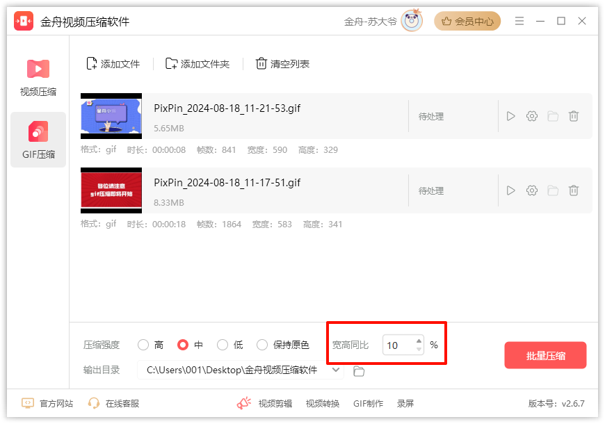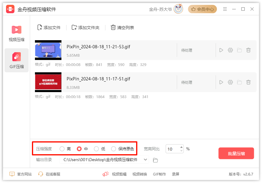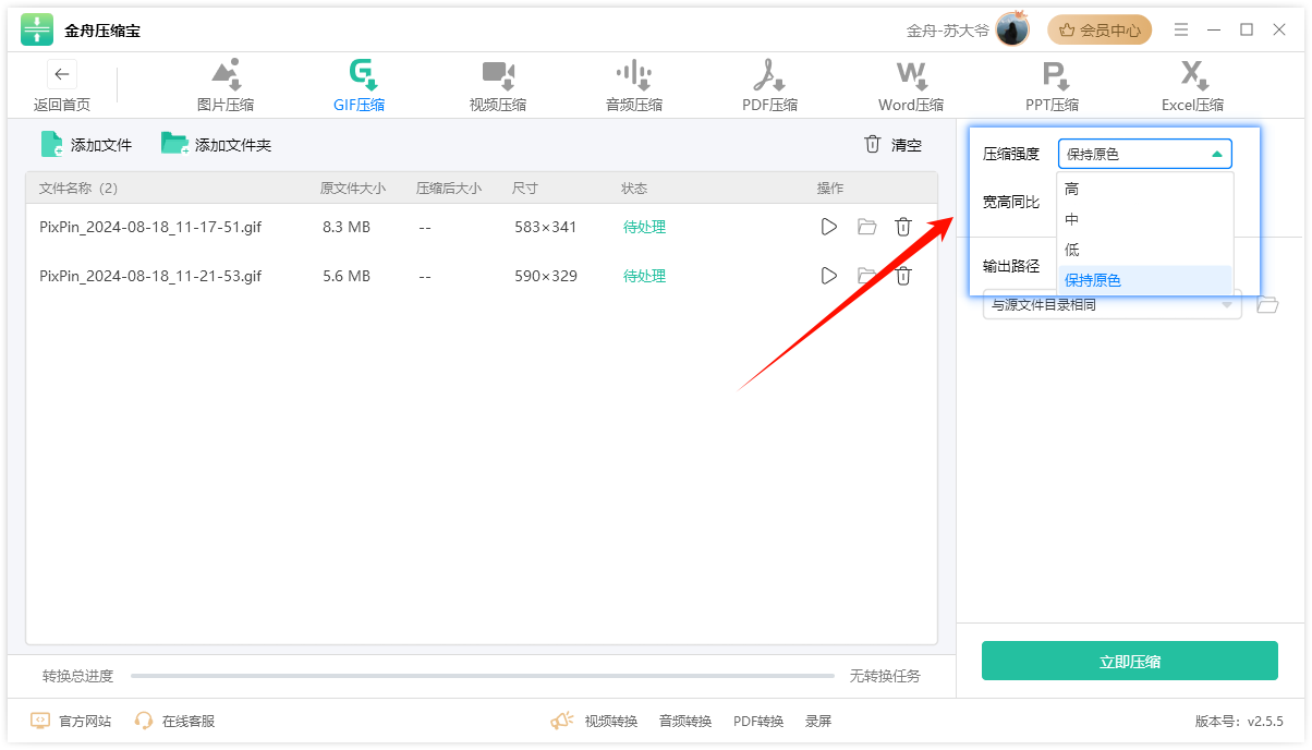 特点:金舟压缩宝凭借其先进的算法,能够有效地减小GIF文件大小,同时不改变画质。它支持批量压缩,用户可以同时上传多个GIF文件进行处理。