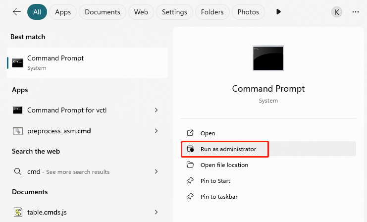 步骤1、在开始菜单的搜索框中键入【cmd】并选择以管理员权限运行。