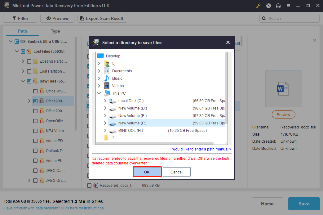 步骤4、在弹出的窗口中,点击【选择目录】选择文件恢复后的保存目录并且点击【确定】就OK了。