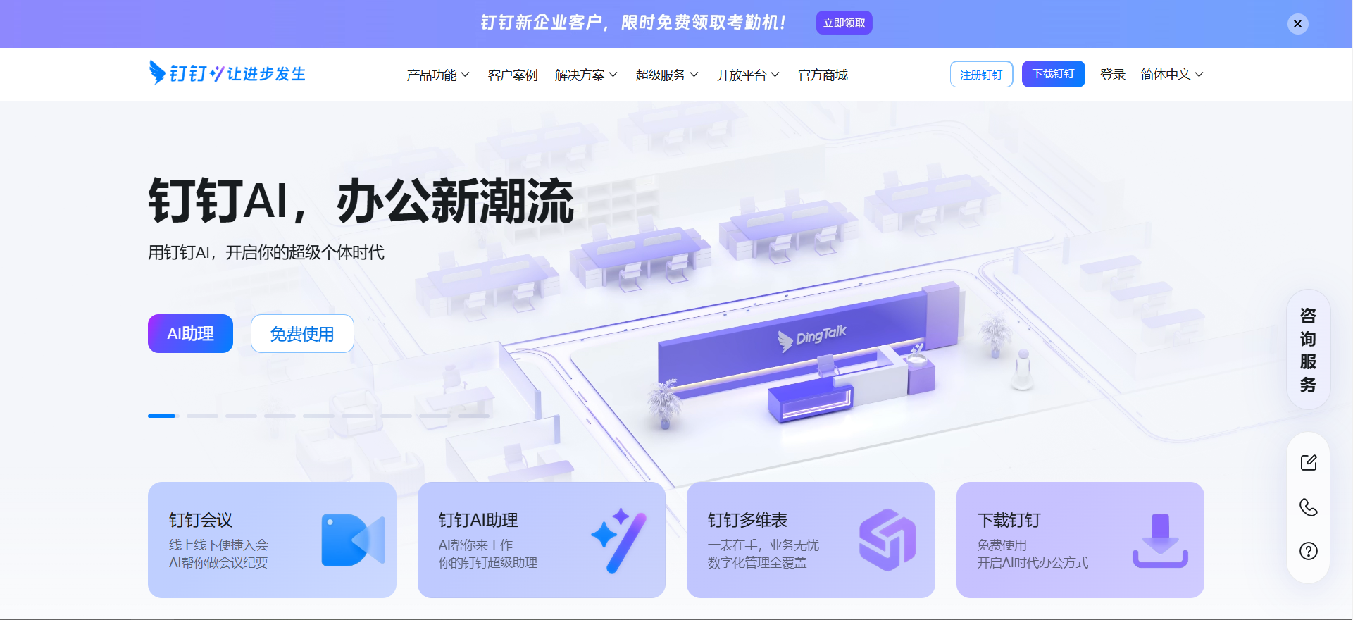 钉钉是一款专注于提升团队协作与个人效率的数字化工具,通过整合多场景功能模块,为用户提供从沟通到任务管理的全流程解决方案。在线网址:www.dingtalk.com