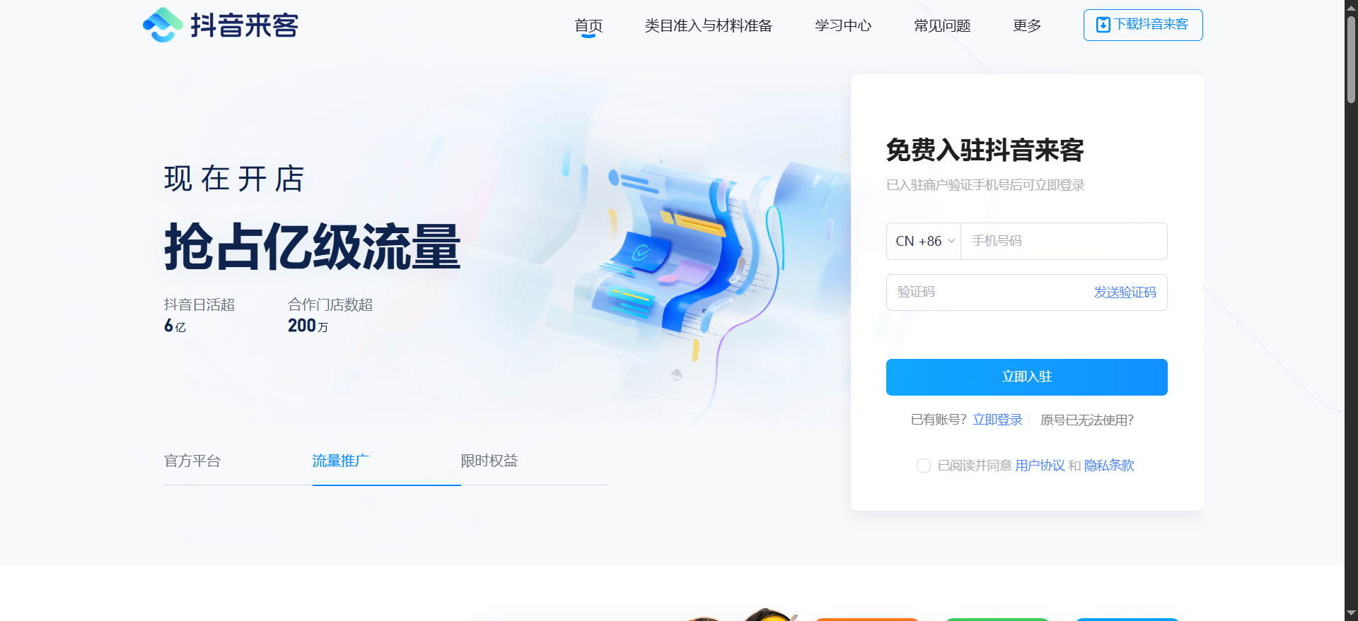 在应用商店搜索 “抖音来客” 下载安装,使用手机号注册并登录。