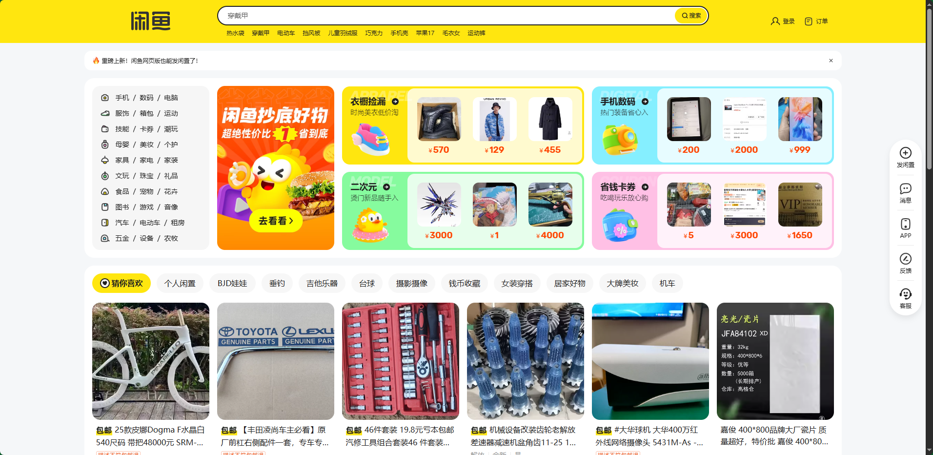 网页版首页布局逻辑清晰,主要分为分类导航、重点品类、兴趣频道三部分,商品展示沿用移动端 “上文下图” 的排版,同时依托大屏实现更多商品同屏陈列。在线观看入口分布合理,商品视频直接嵌入详情页,直播内容可通过 “闲鱼夜市” 频道或搜索功能快速找到,输入关键词即可精准定位特定商品的相关视频或直播。网页版适配不同尺寸的电脑屏幕,操作流畅,经常使用的用户可将官网添加至浏览器书签,实现一键快速访问,成为日常挑选二手商品、比对细节的便捷工具,未来还将逐步完善更多移动端同步功能,提升使用体验。