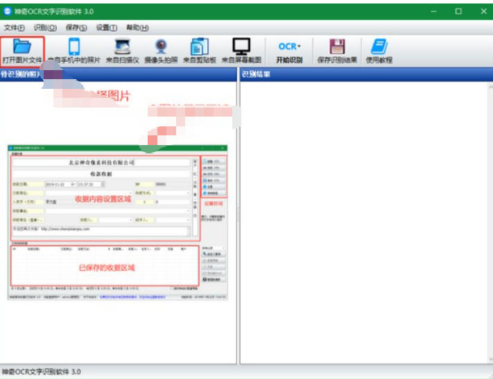 第一步:打开等待识别文字的图片,支持图片文件、来自手机中的图片、来自扫描仪的图片、摄像头拍照、来自剪贴板的图片、来自屏幕截图,打开之后图片会显示在左侧“图片显示区域”内,界面如下: