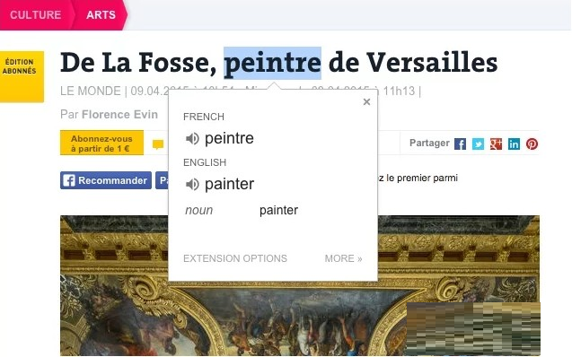 2.在Chrome的浏览器中遇到不认识的单词的时候,直接使用鼠标划动选中该单词即可快速使用Google翻译插件进行翻译,如图所示:
