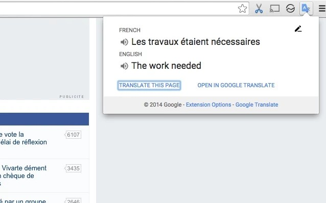 4.如果用户想要翻译整个网页中的词语到指定的语言,可以直接点击Chrome右上角的Google翻译插件按钮,并在弹出窗口中点击翻译此页的按钮,即可快速地启动全页翻译的功能,如图所示: