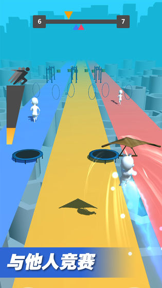 2、设置创意加速道具,滑板、滑翔机等辅助装备,能让小人近道超车。
