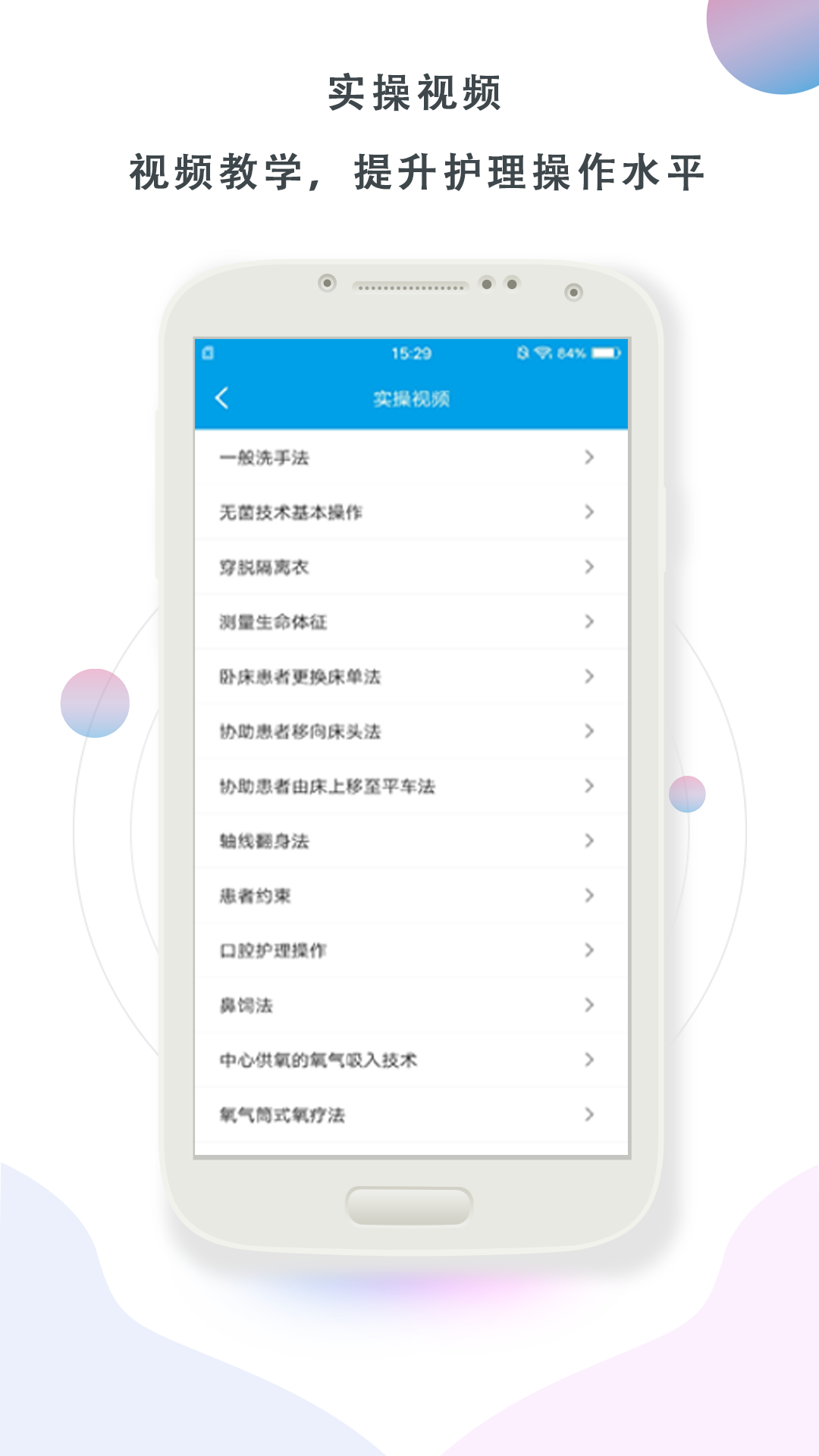 帮助护士随时随地的进行实践知识培训。视频授课更易吸收,利用碎片时间学习55项护理操作技术规范,提升护理操作水平,随时随地掌握护理知识