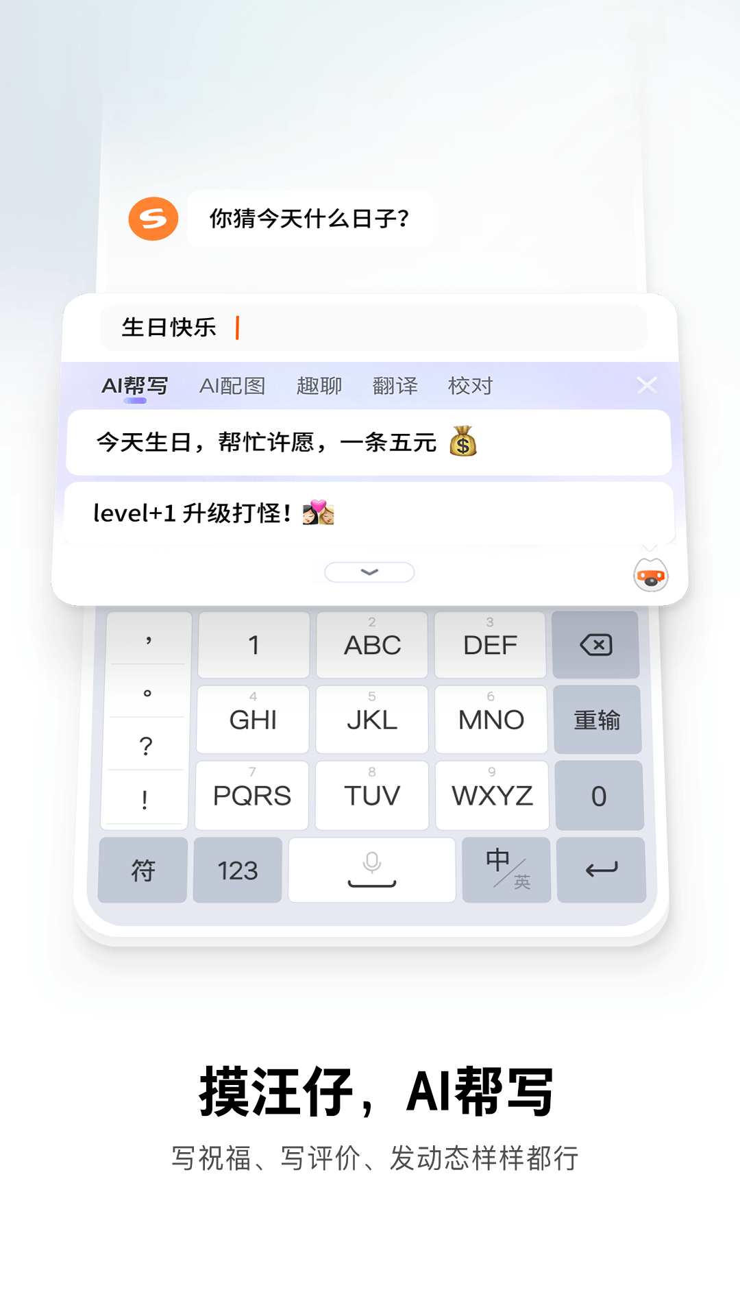 搜狗输入法,拥有超大中文词库,输入更加准确,智能。搜狗智能旺仔带你用AI表达,斗图,妙语,输入更加有趣。