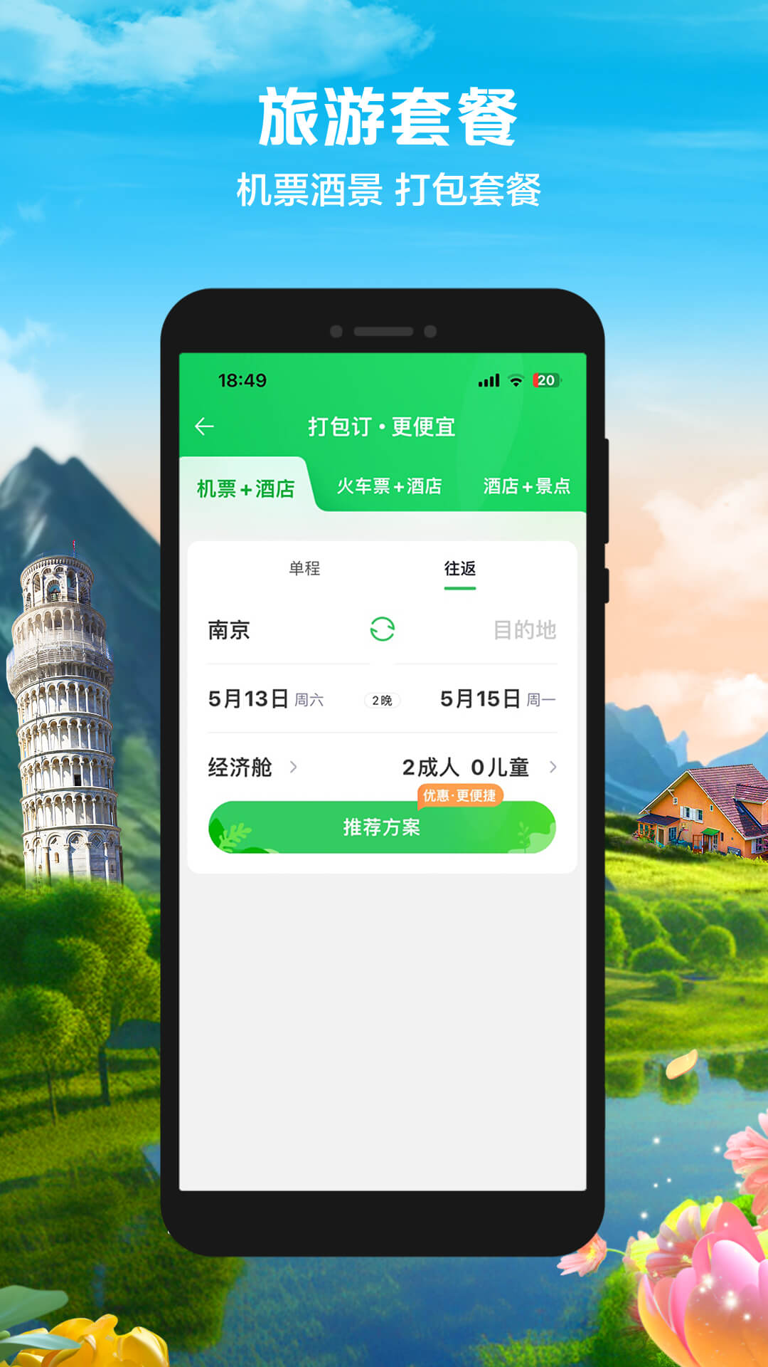 支持全品类动态打包,用户可以自主定制、任意组合出行方式、住宿、玩乐等,让产品供给与需求的连接高效地满足了客户多样化出游需求,同时实现了“打包订,更便宜”的产品优势。
