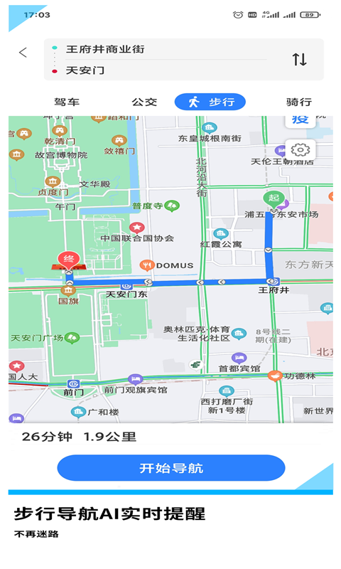 依托大数据与AI算法,根据用户选择的出行工具(如打车、公交、地铁等)自动计算高效路线。