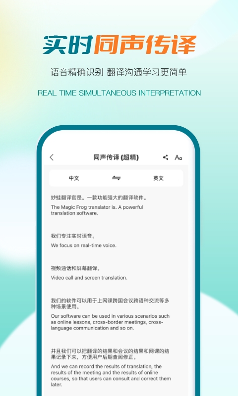 我们支持多种语言的同声传译,并带有网页同传,让您上网课、开跨国会议自带翻译字幕,不再担心听不懂,同时支持翻译记录查询,课后复习和会后总结也变得非常简单。 华军软件园提供译妙蛙翻译官app官方版下载地址,有需要的用户可免费下载使用!