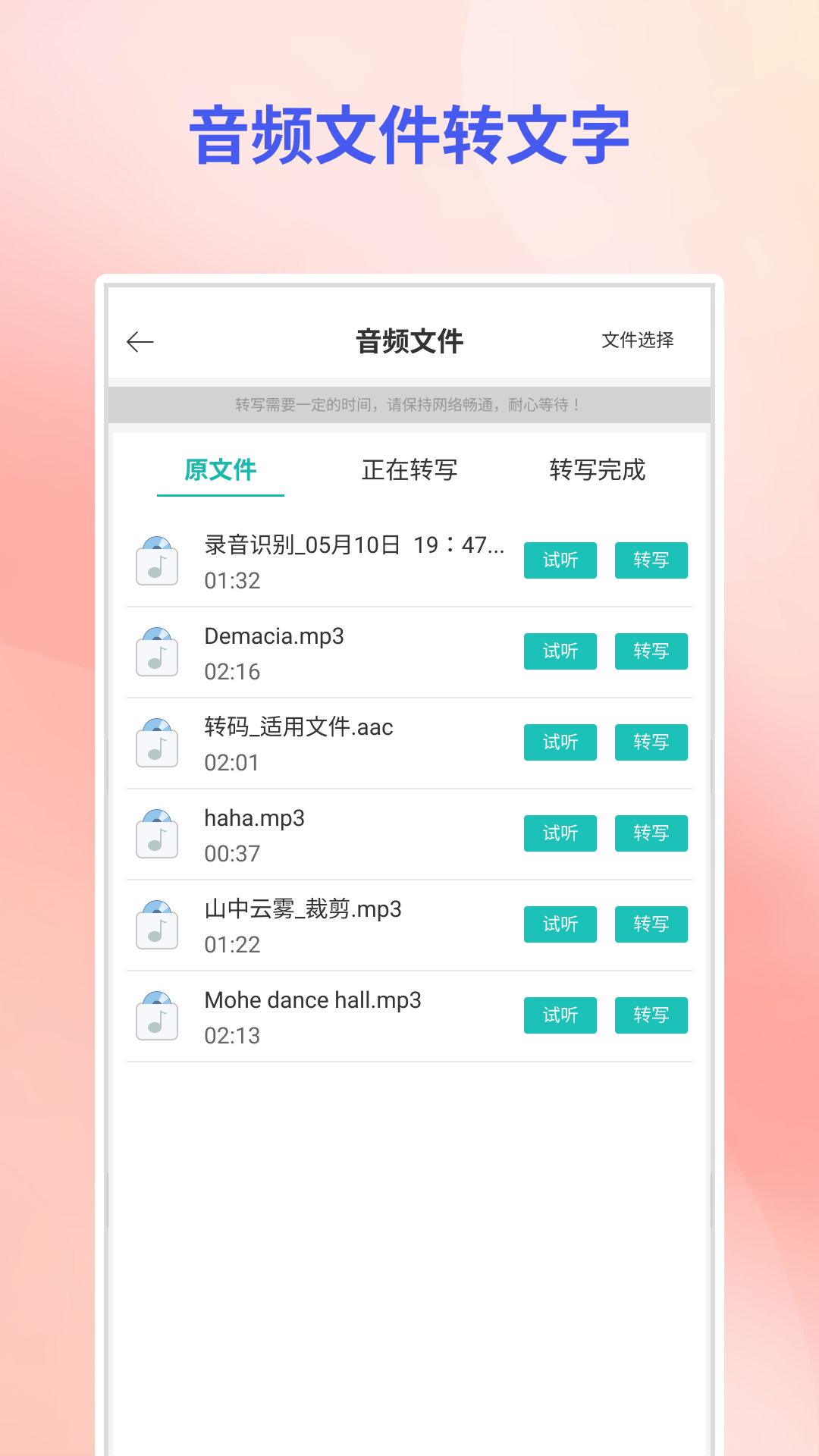 1.音频文件转文字:可将录音文件,外部导入音频文件,一键转写成文字,支持长音频转写和多个文件同时转写;